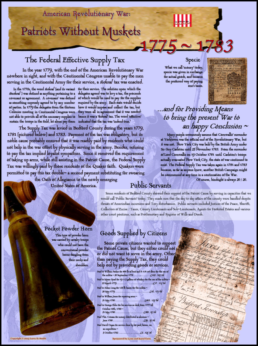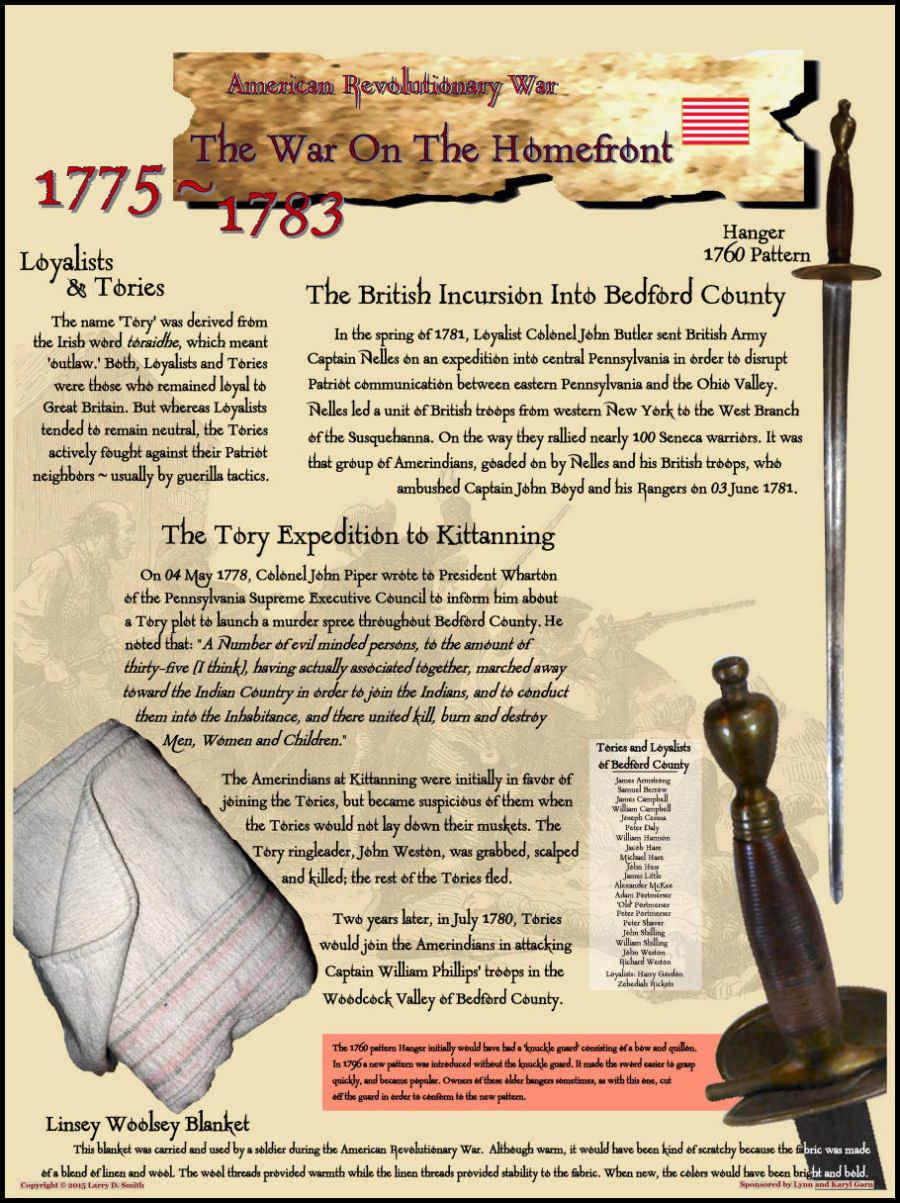 An exhibit of authentic American Revolutionary War artifacts and informative panels was shown at the Bedford County Historical Society. The exhibit opened to the public on 16 May 2016 and continued through the end of the year.