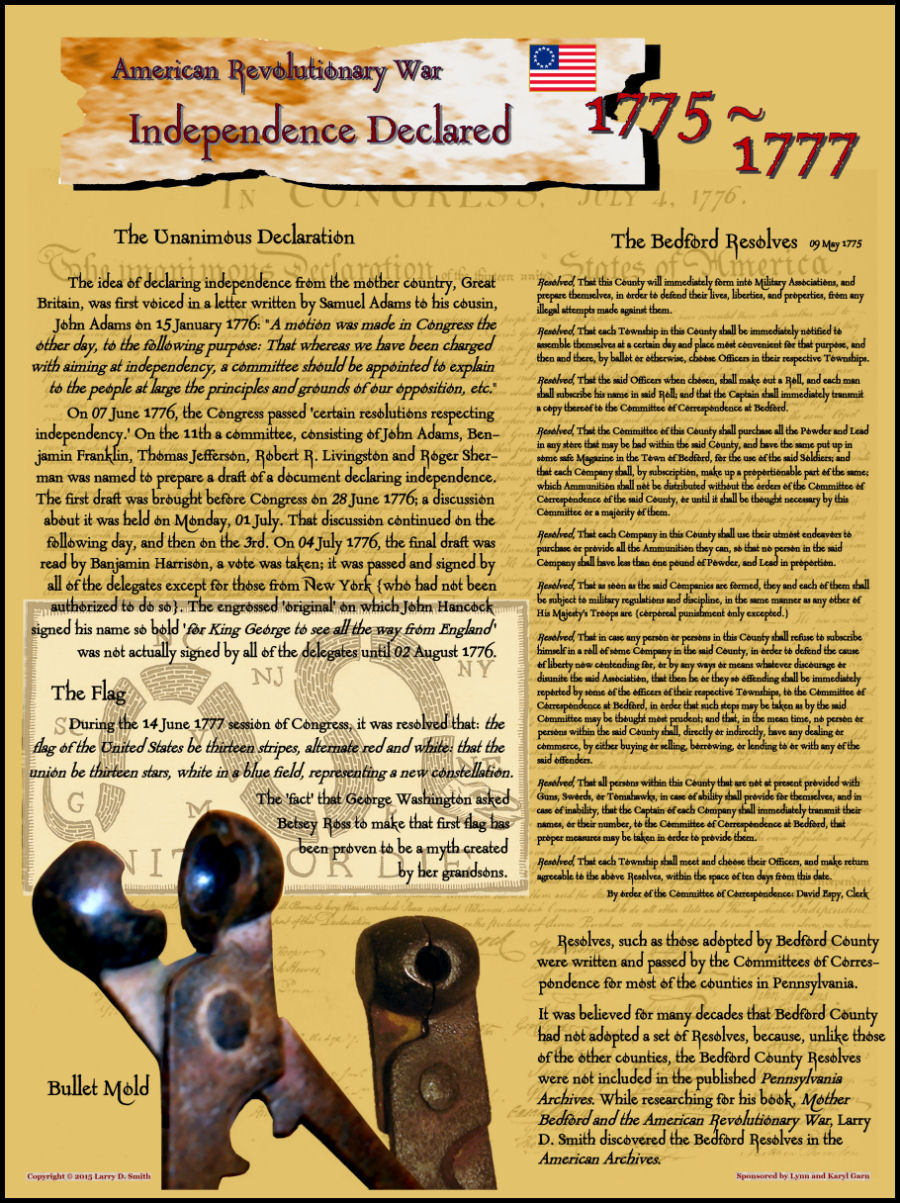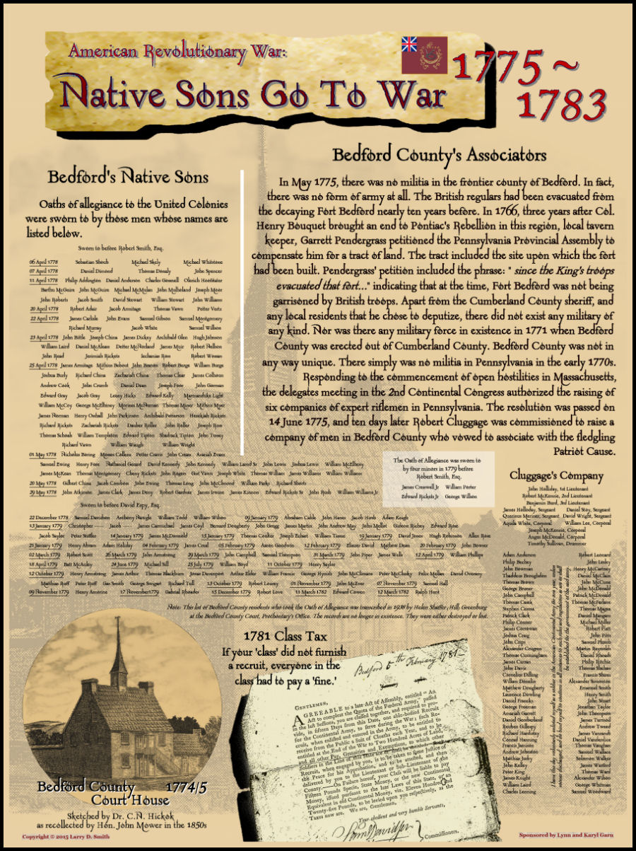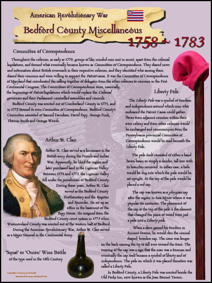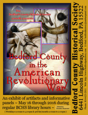 An exhibit of authentic American Revolutionary War artifacts and informative panels was shown at the Bedford County Historical Society. The exhibit opened to the public on 16 May 2016 and continued through the end of the year.